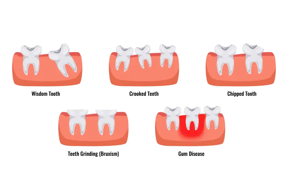 - Impacted Wisdom Tooth Can cause inflammation, jaw pain, and difficulty opening the mouth. Often requires surgical removal.
